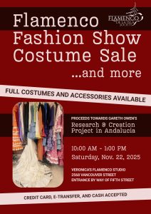 Full costumes and accessories available! Proceeds towards Gareth Owen’s Research & Creation project in Andalucia. Credit card, e-transfer, and cash accepted. Date: Saturday, November 22,